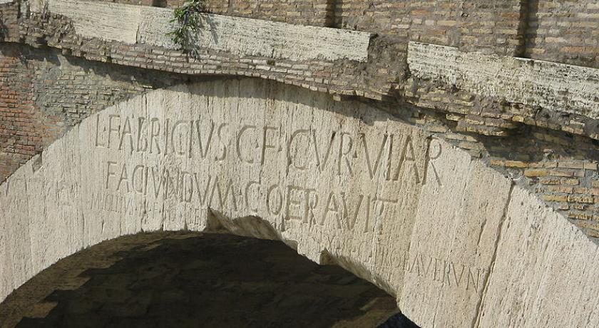 An original inscription on the travertine commemorates its builder in Latin, L . FABRICIVS . C . F . CVR . VIAR | FACIVNDVM . COERAVIT | IDEMQVE | PROBAVIT. (Lucius Fabricius, Son of Gaius, Superintendent of the roads, took care and likewise approved that it be built) It is repeated four times: on each arch, on both sides of the bridge.